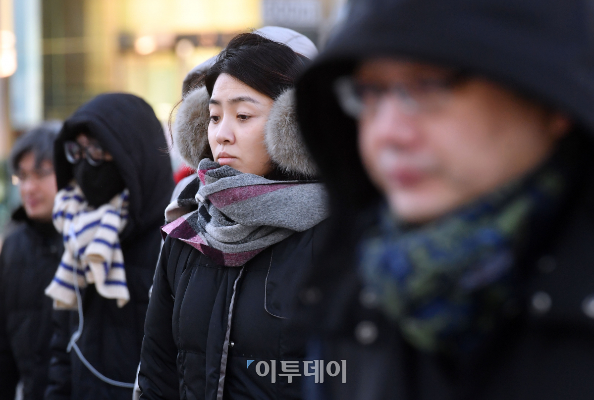 서울의 아침 최저기온이 영하 13도까지 떨어지는 등 중부지방에 한파특보가 발효된 23일 오전 서울 세종대로사거리에서 시민들이 두터운 옷을 껴입고 발걸음을 재촉하고 있다. 기상청은 당분간 내륙을 중심으로 아침 최저 기온이 영하 10~15도 안팎으로 떨어지며 한파가 지속될 것으로 예보했다. 이동근 기자 foto@