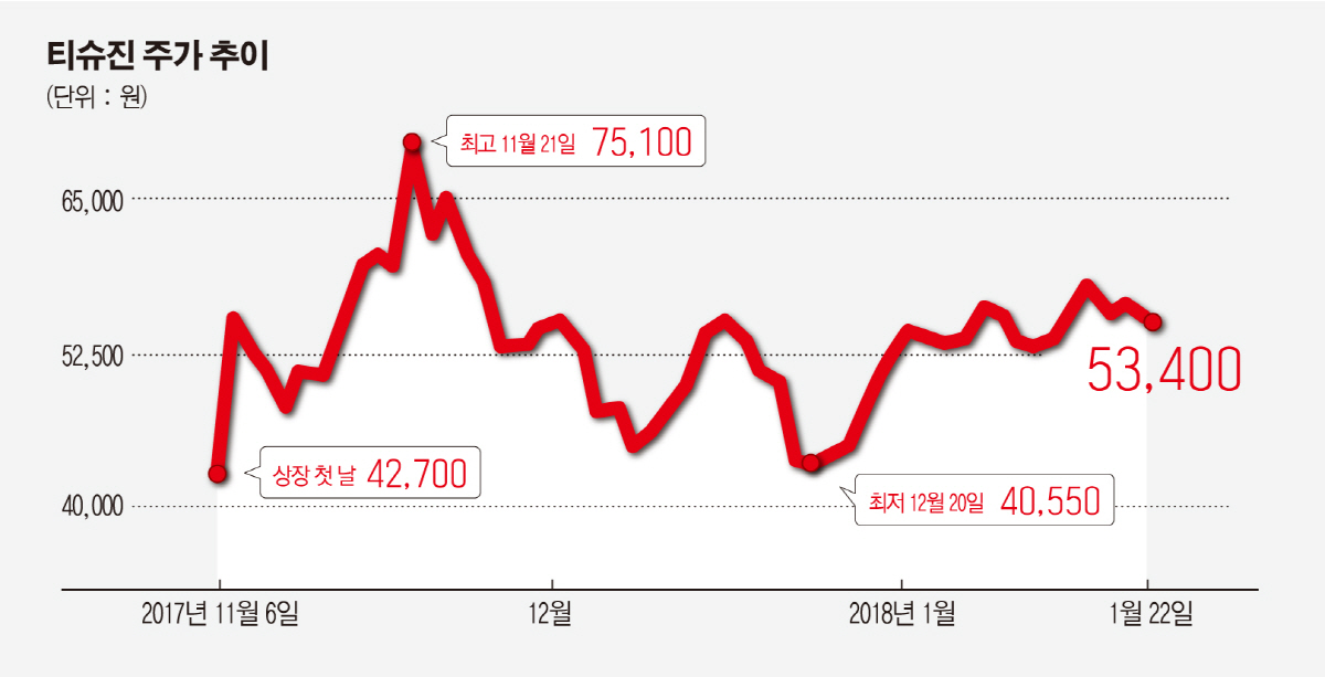 19일 티슈진은 5만4400원으로 장을 마감했다. 공모가(2만7000원)에 비하면 두 배 이상을 기록하고 있으나, 상장 당시 기대감에 비하면 미진한 성적이다. 엄여진 신영증권 연구원은 최근 보고서를 통해 “인보사의 국내 판매 호조를 고려해볼 때 향후 글로벌 시장에서도 고가 전략이 유효할 것으로 전망된다”라고 분석한 바 있다. 특히 코오롱생명과학과 미쓰비시타나베를 통한 인보사의 일본사업 가치는 2655억 원으로 추정했다. 또 미국과 일본 두 시장을 합산한 결과, 인보사의 적정가치로 4조5595억 원을 제시했다.