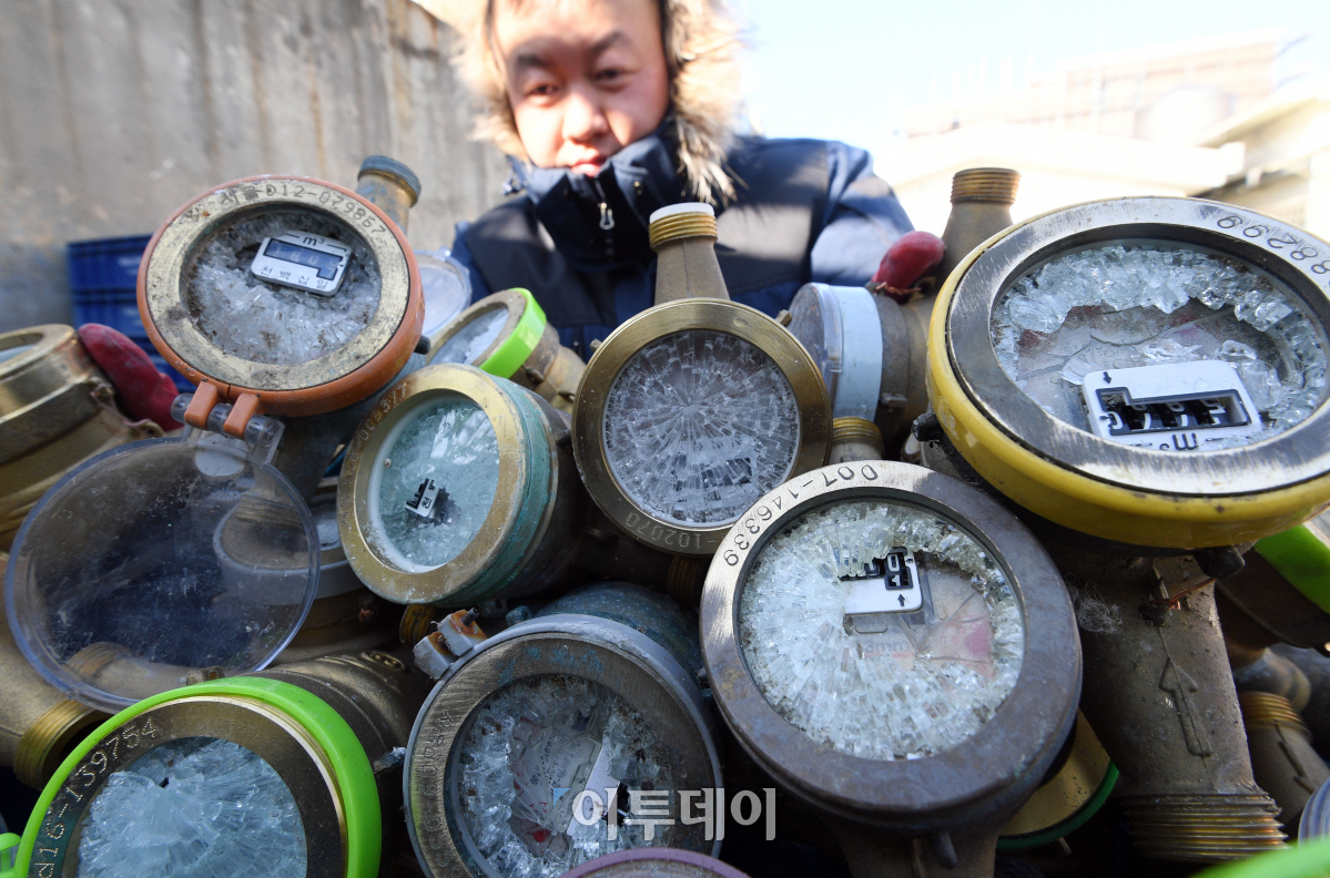 수도권 등 중부지방에 한파경보가 발효된 23일 서울 종로구 효자동 중부수도사업소 효자가압장에서 관계자가 동파된 수도계량기를 정리하고 있다. 이동근 기자 foto@