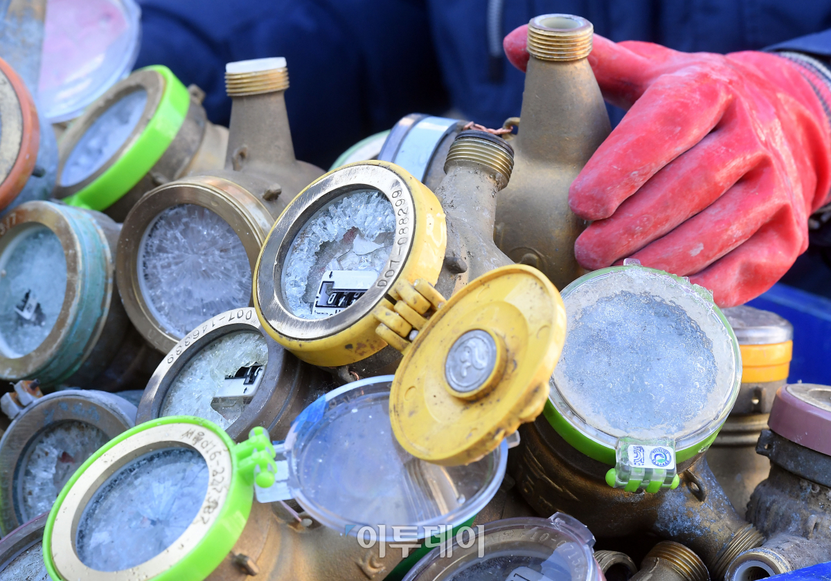 수도권 등 중부지방에 한파경보가 발효된 23일 서울 종로구 효자동 중부수도사업소 효자가압장에서 관계자가 동파된 수도계량기를 정리하고 있다. 이동근 기자 foto@