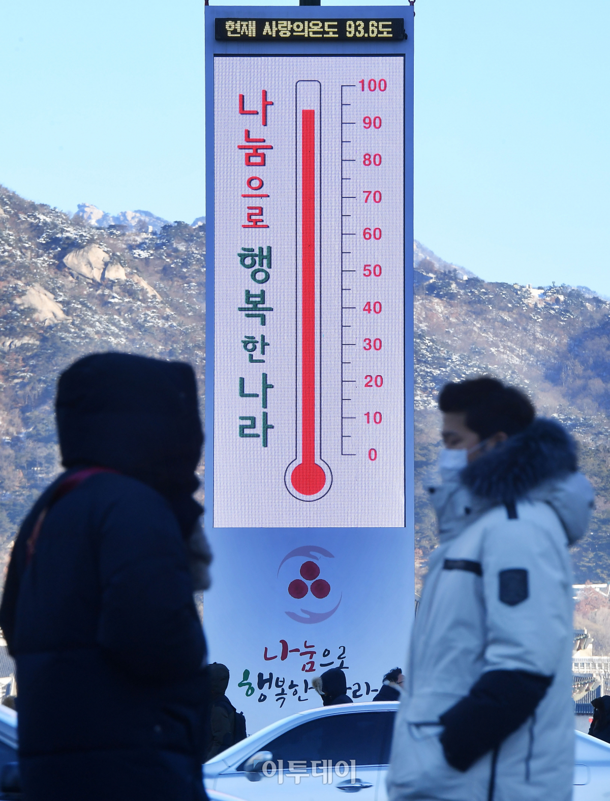 전국에 몰아친 한파에 사랑의 온도탑도 얼어붙었다. 이영학 사건 등으로 기부금에 대한 사회적 불신과 기업의 기부문화 위축 등이 영향을 미쳤다는 분석이다. 모금 마감을 일주일 앞둔 24일 오전 서울 광화문 광장 사랑의 온도탑이 93.6도를 가리키고 있다. 지난해 11월 20일 설치된 온도탑은 목표액 3994억 원의 1%가 모였을 때 1도씩 오른다. 이동근 기자 foto@