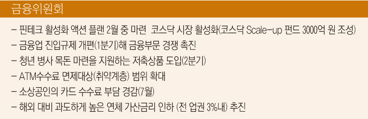 이밖에 금융위는 △PEF 진입 운용 규제 개선 △크라우드 펀딩 활성화 △코스닥 시장 활성화 △저소득층 ATM 수수료 부담 완화 △소상공인 카드수수료 경감 등의 업무를 올해 추진할 계획이다.