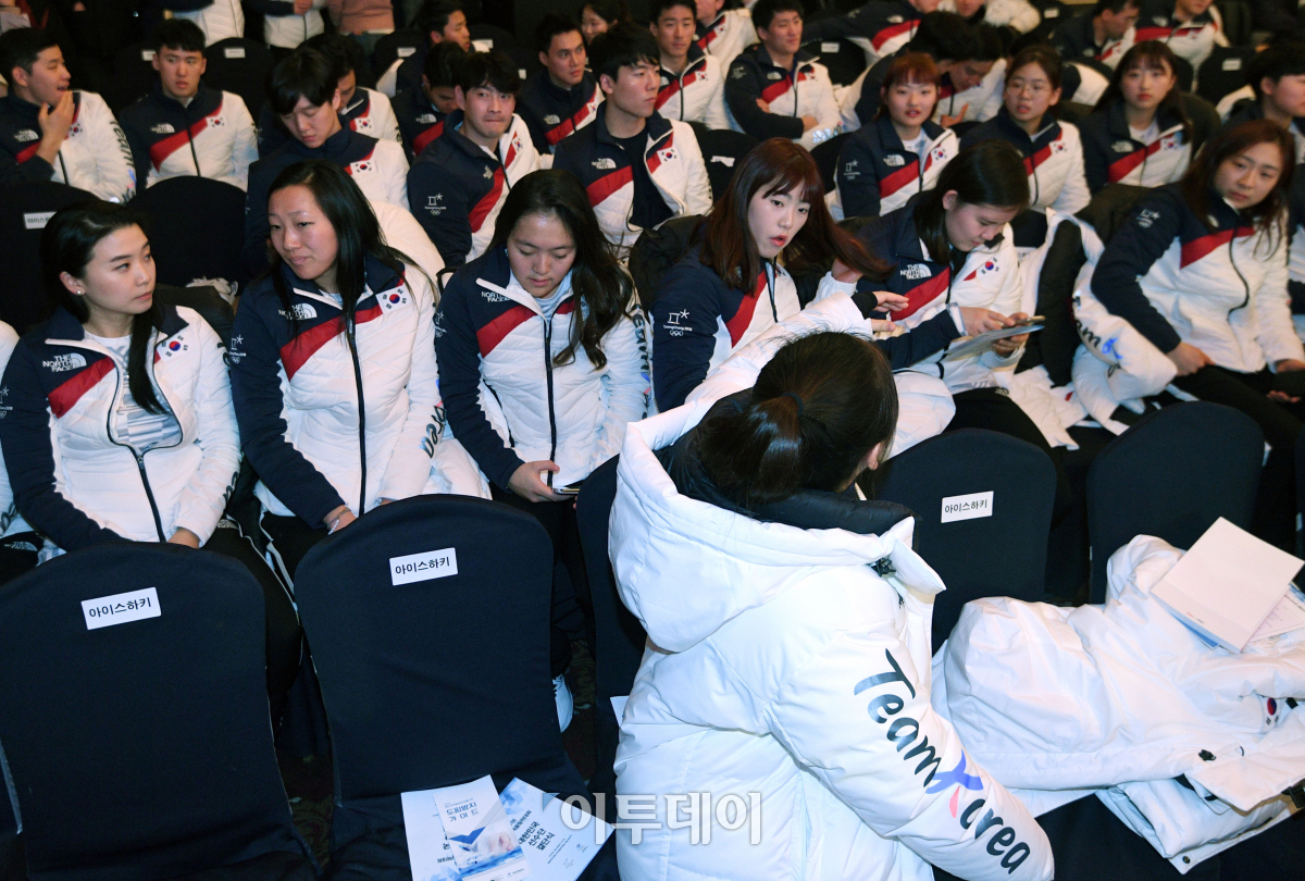 여자 아이스하키 국가대표 선수들이 24일 오후 서울 송파구 올림픽파크텔에서 열린 2018 평창동계올림픽 대한민국 선수단 결단식에 참석하고 있다. 15개 종목 218명의 대한민국 선수단은 '금메달 8개, 종합 4위 달성'을 목표로 개최지인 평창으로 향한다. 이동근 기자 foto@