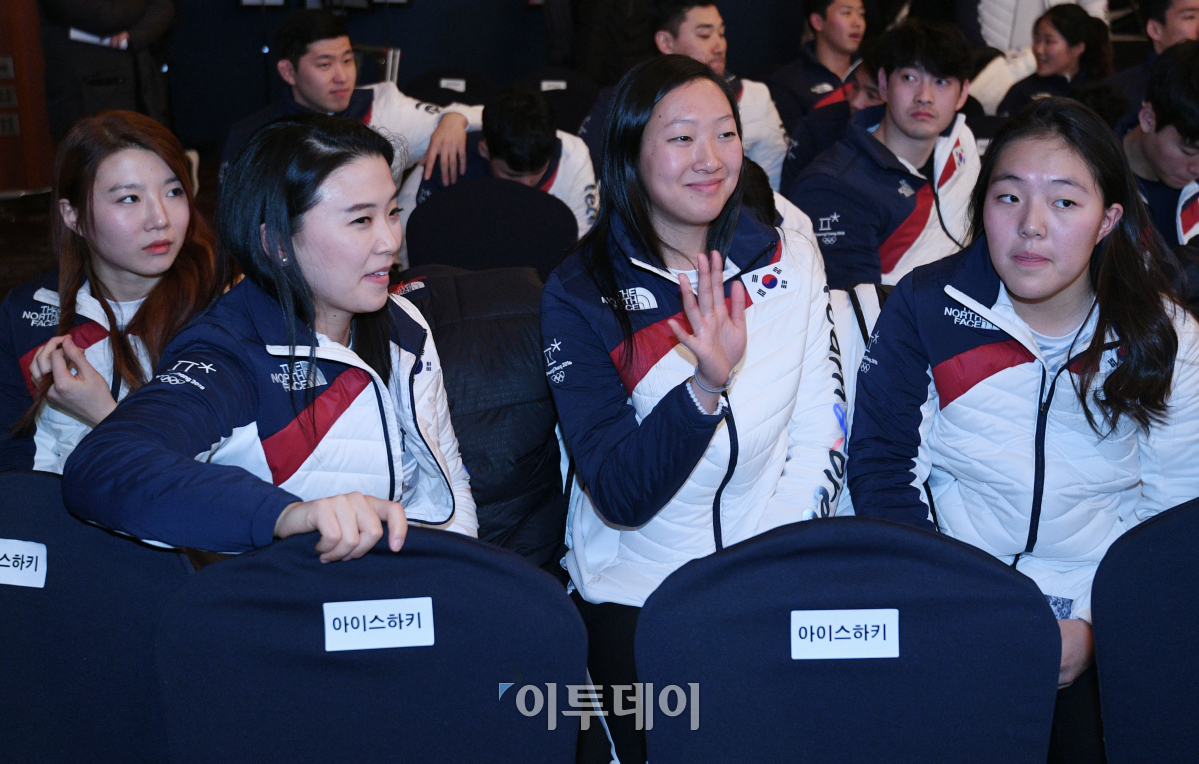 여자 아이스하키 국가대표 선수들이 24일 오후 서울 송파구 올림픽파크텔에서 열린 2018 평창동계올림픽 대한민국 선수단 결단식에 참석하고 있다. 15개 종목 218명의 대한민국 선수단은 '금메달 8개, 종합 4위 달성'을 목표로 개최지인 평창으로 향한다. 이동근 기자 foto@