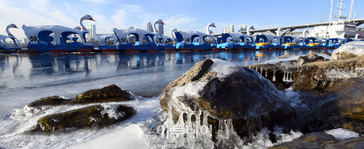 북극한기의 영향으로 연일 최강한파가 이어지고 있는 25일 오전 서울 뚝섬유원지 선착장에 얼음이 얼어있다. 기상청은 추위가 당분간 이어지면서 중부지방과 일부 남부내륙에는 아침 기온이 영하 15도 이하로, 그 밖의 지역은 영하 10도 이하로 떨어질 것으로 예보했다. 이동근 기자 foto@