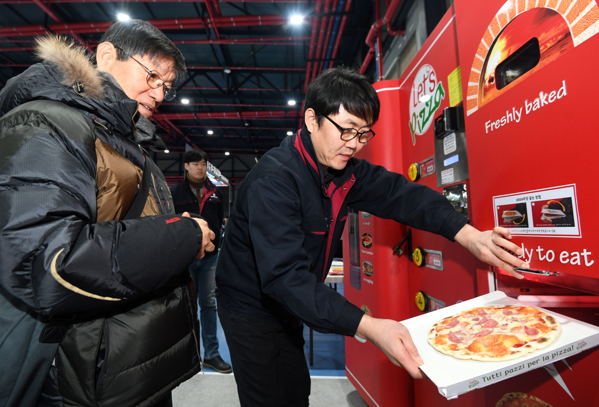 2018 서울 샵디자인테크 전시회가 25일 서울 강남구 세텍에서 열린 가운데 관계자가 피자 자동판매기 작동 원리를 설명하고 있다. 올해 처음으로 열리는 이번 전시는 4차 산업혁명, 무인 점포, 스마트샵 등 변화의 시대를 맞이하고 있는 리테일 산업에 첨단 트렌드와 비전을 제시한다. 이동근 기자 foto@.