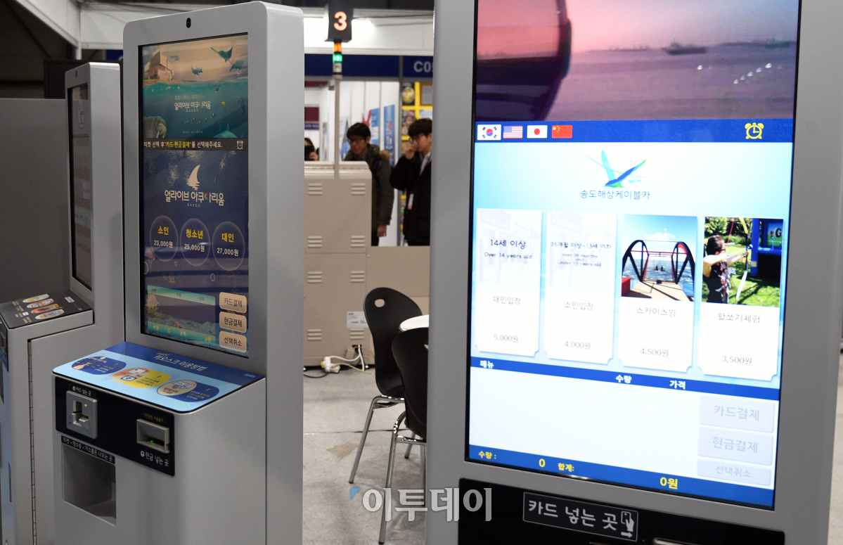 2018 서울 샵디자인테크 전시회가 25일 서울 강남구 세텍에서 열린 가운데 전시장에 다양한 종류의 키오스크 기기들이 진열돼 있다. 올해 처음으로 열리는 이번 전시는 4차 산업혁명, 무인 점포, 스마트샵 등 변화의 시대를 맞이하고 있는 리테일 산업에 첨단 트렌드와 비전을 제시한다. 이동근 기자 foto@.