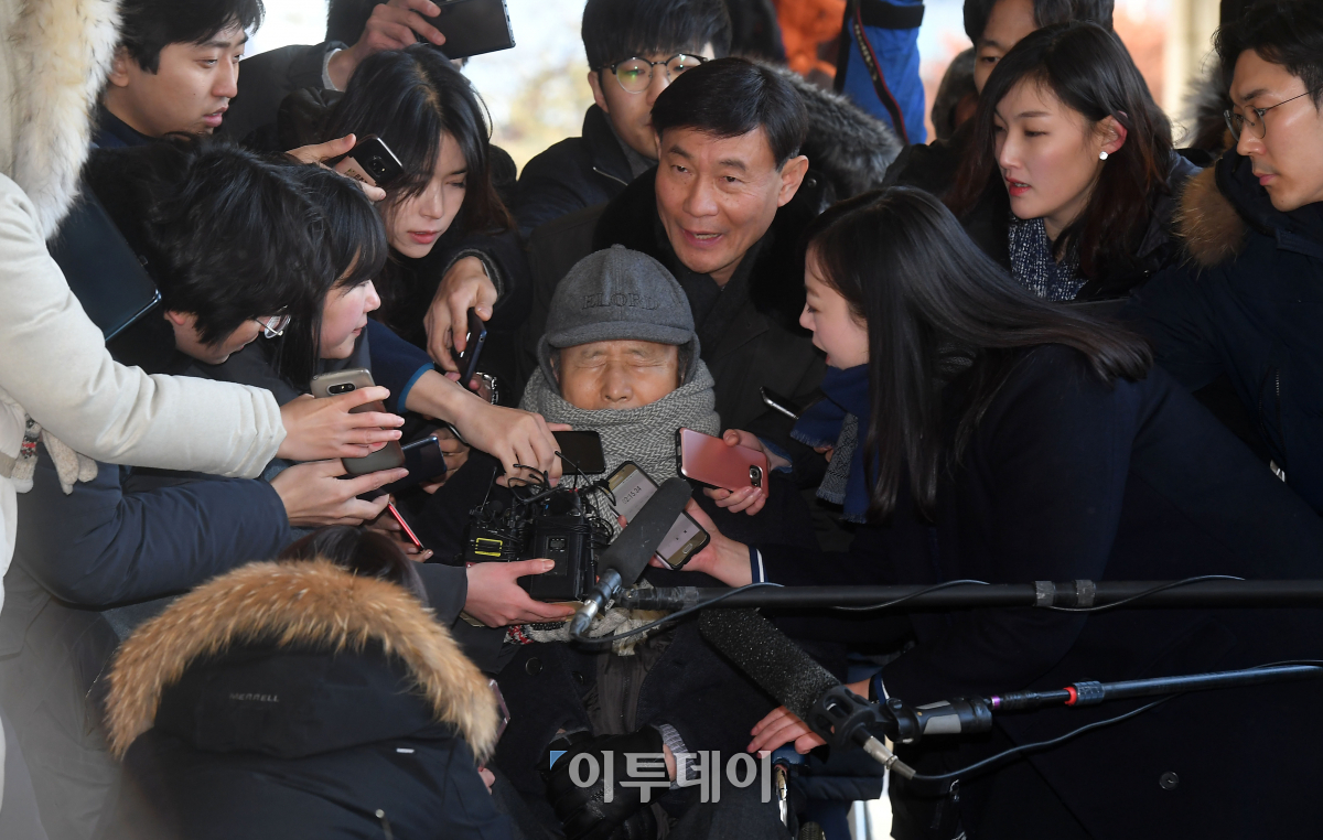 억대 국정원 특수활동비 수수 혐의를 받는 이명박 전 대통령의 형 이상득 전 의원이 26일 오전 서울중앙지검에 피의자 신분으로 출석하고 있다. 이동근 기자 foto@