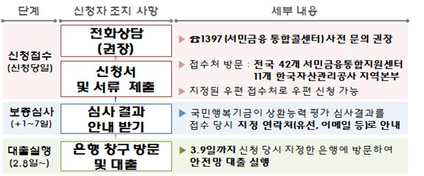 사전신청 희망자는 이달 29일부터 내달 7일까지 전국 42개 서민금융통합지원센터나 11개 자산관리공사(캠코) 지역본부를 방문해 신청하면 된다. 신청 시엔 본인확인 서류, 소득증빙서류, 채무확인서류를 제출해야 한다.