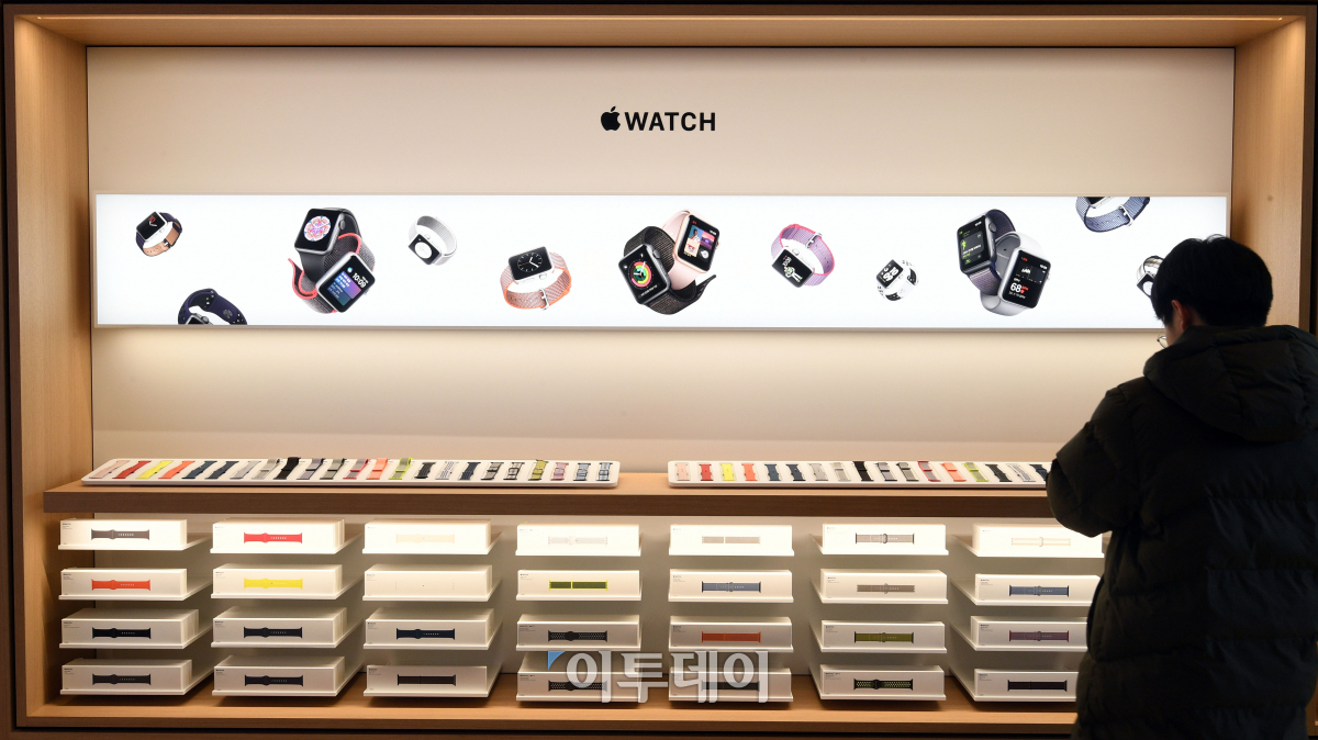 국내 첫 애플스토어 개장후 첫 주말인 28일 서울 강남구 애플 가로수길을 찾은 시민이 제품을 살펴보고 있다. 이동근 기자 foto@