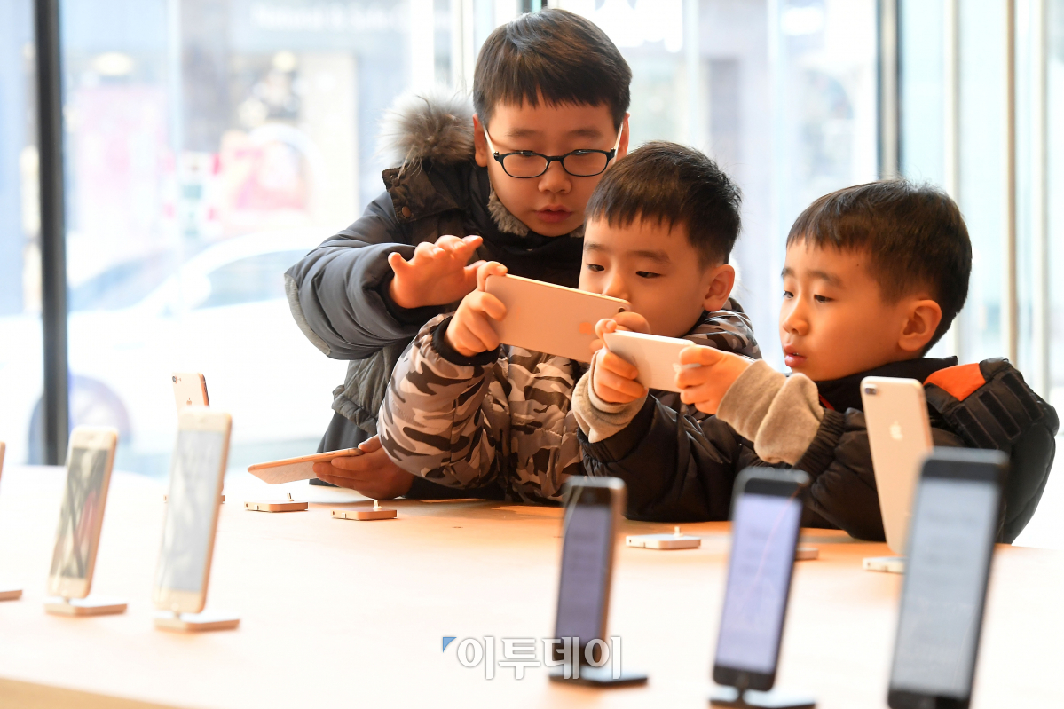 국내 첫 애플스토어 개장후 첫 주말인 28일 서울 강남구 애플 가로수길을 찾은 어린이들이 제품 체험을 하고 있다. 이동근 기자 foto@