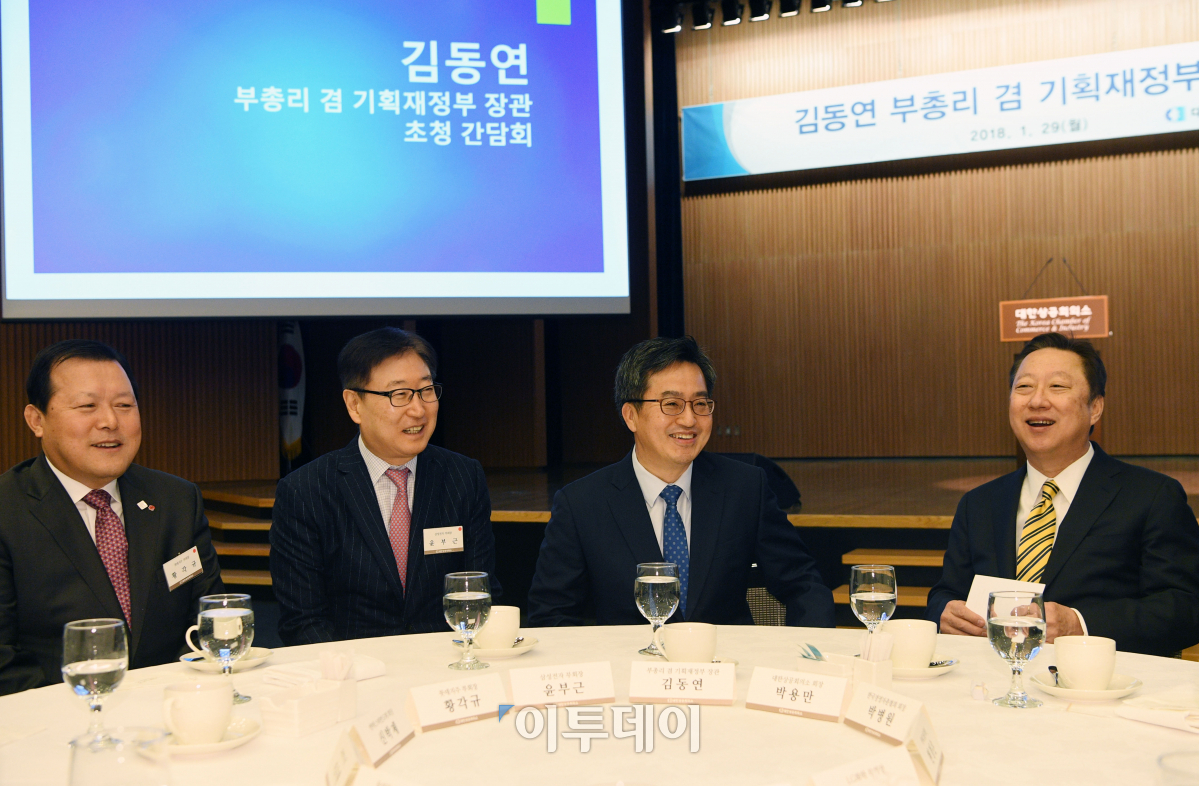 김동연 경제부총리 겸 기획재정부 장관이 29일 오전 서울 중구 대한상공회의소에서 열린 초청 간담회에 참석해 박용만 대한상의 회장 등 참석자들과 대화하고 있다. 왼쪽부터 황각규 롯데지주 부회장, 윤부근 삼성전자 부회장, 김 부총리, 박 회장. 이동근 기자 foto@