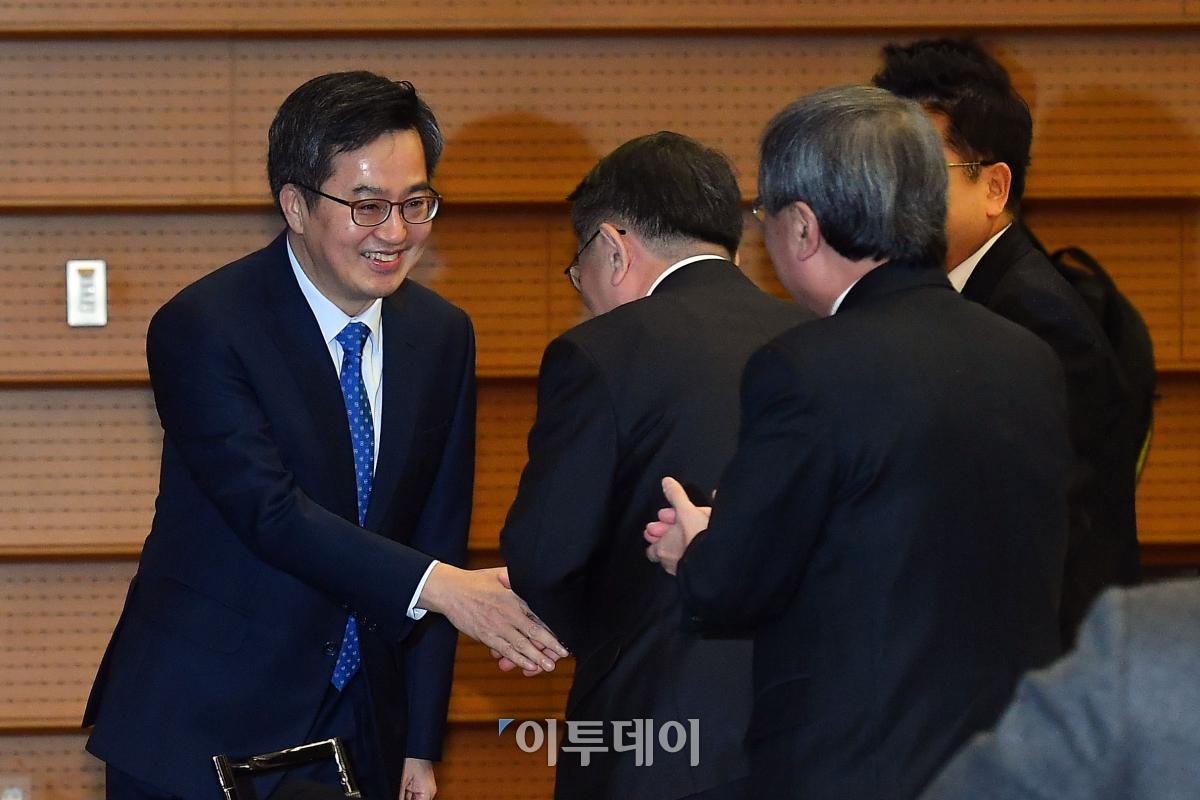 김동연 경제부총리 겸 기획재정부 장관이 29일 오전 서울 중구 대한상공회의소에서 열린 초청 간담회에서 참석자들과 인사하고 있다. 이동근 기자 foto@