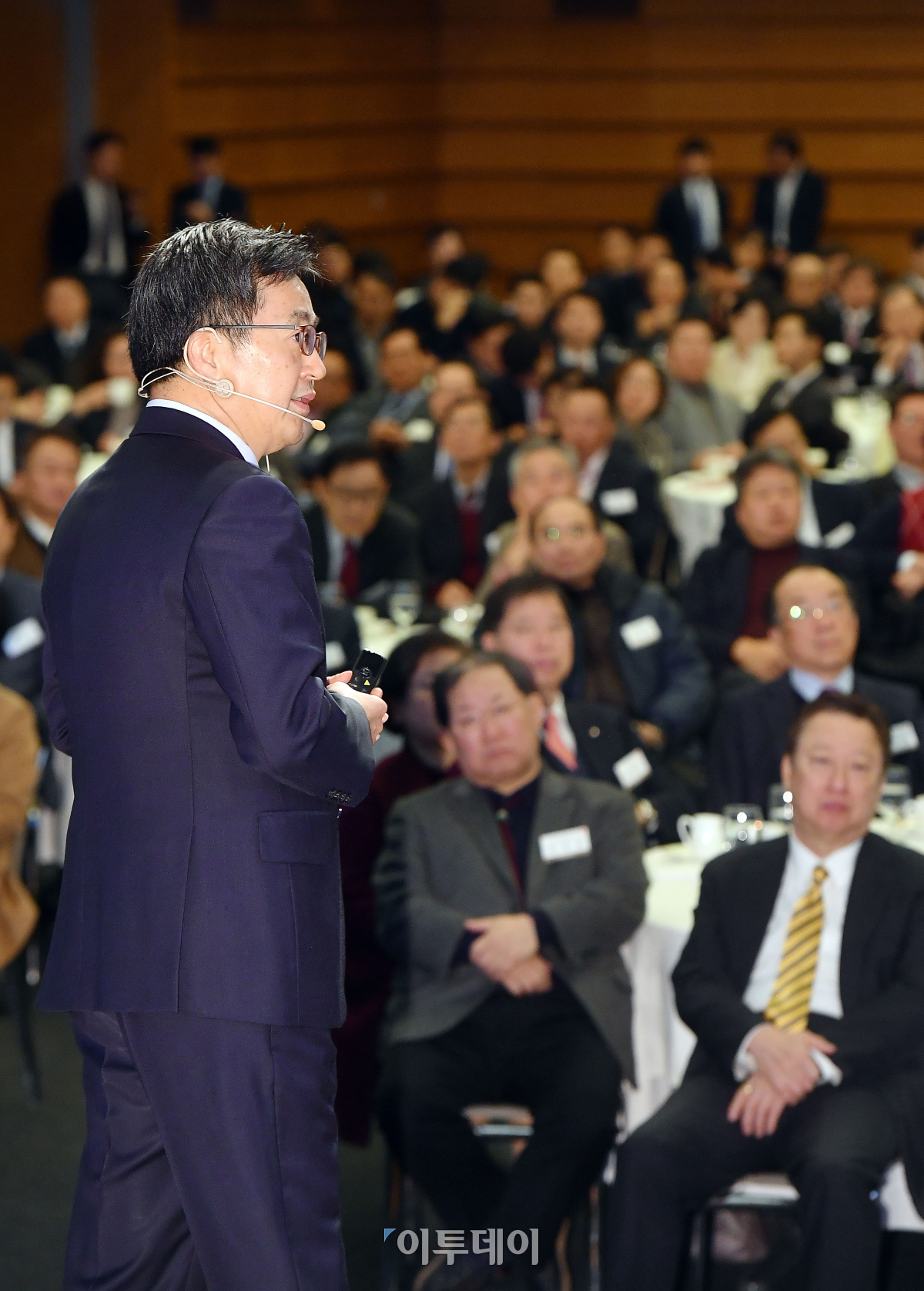 김동연 경제부총리 겸 기획재정부 장관이 29일 오전 서울 중구 대한상공회의소에서 열린 초청 간담회에 참석해 '혁신, 경제를 바꾸는 힘'을 주제로 강연하고 있다. 이동근 기자 foto@