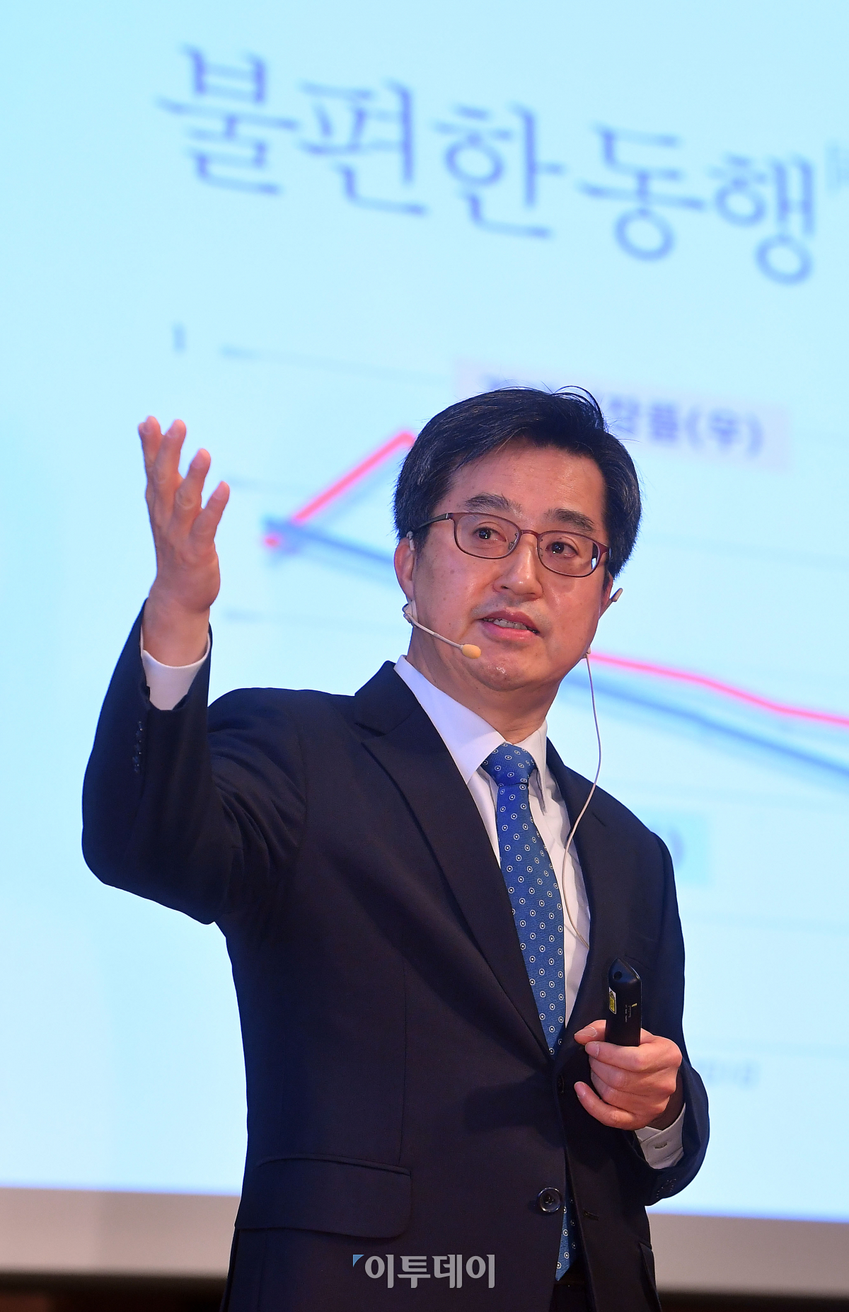 김동연 경제부총리 겸 기획재정부 장관이 29일 오전 서울 중구 대한상공회의소에서 열린 초청 간담회에 참석해 '혁신, 경제를 바꾸는 힘'을 주제로 강연하고 있다. 이동근 기자 foto@