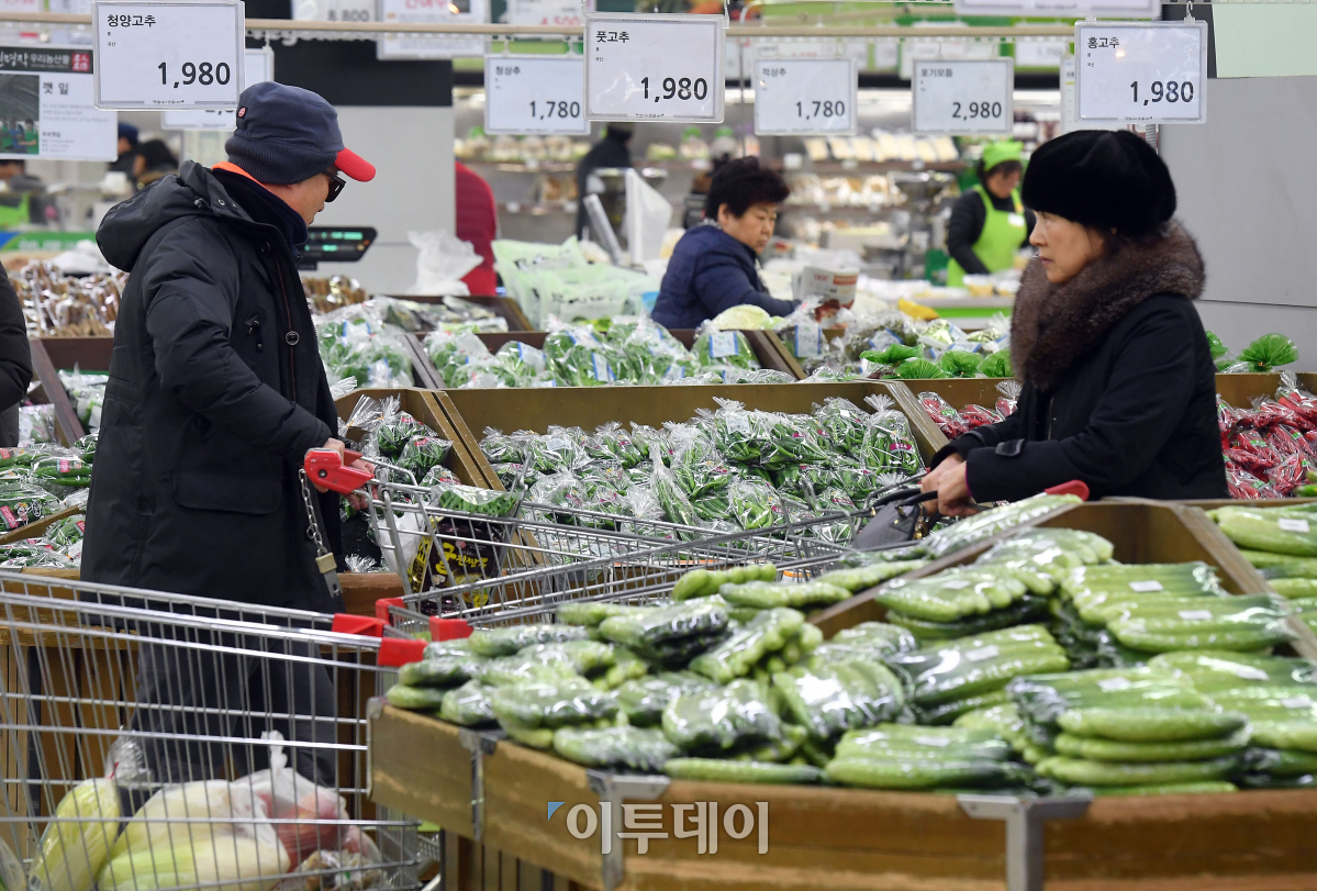 연일 지속된 최강 한파에 채소, 과일 등의 가격이 치솟으며 설을 앞두고 장바구니 물가에 비상이 걸린 가운데 29일 서울의 한 대형마트에서 소비자들이 채소를 살펴보고 있다. 이동근 기자 foto@