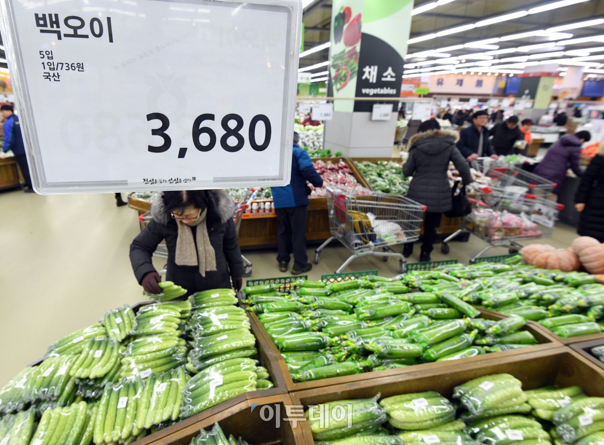 연일 지속된 최강 한파에 채소, 과일 등의 가격이 치솟으며 설을 앞두고 장바구니 물가에 비상이 걸린 가운데 29일 서울의 한 대형마트에서 소비자들이 채소를 살펴보고 있다. 이동근 기자 foto@