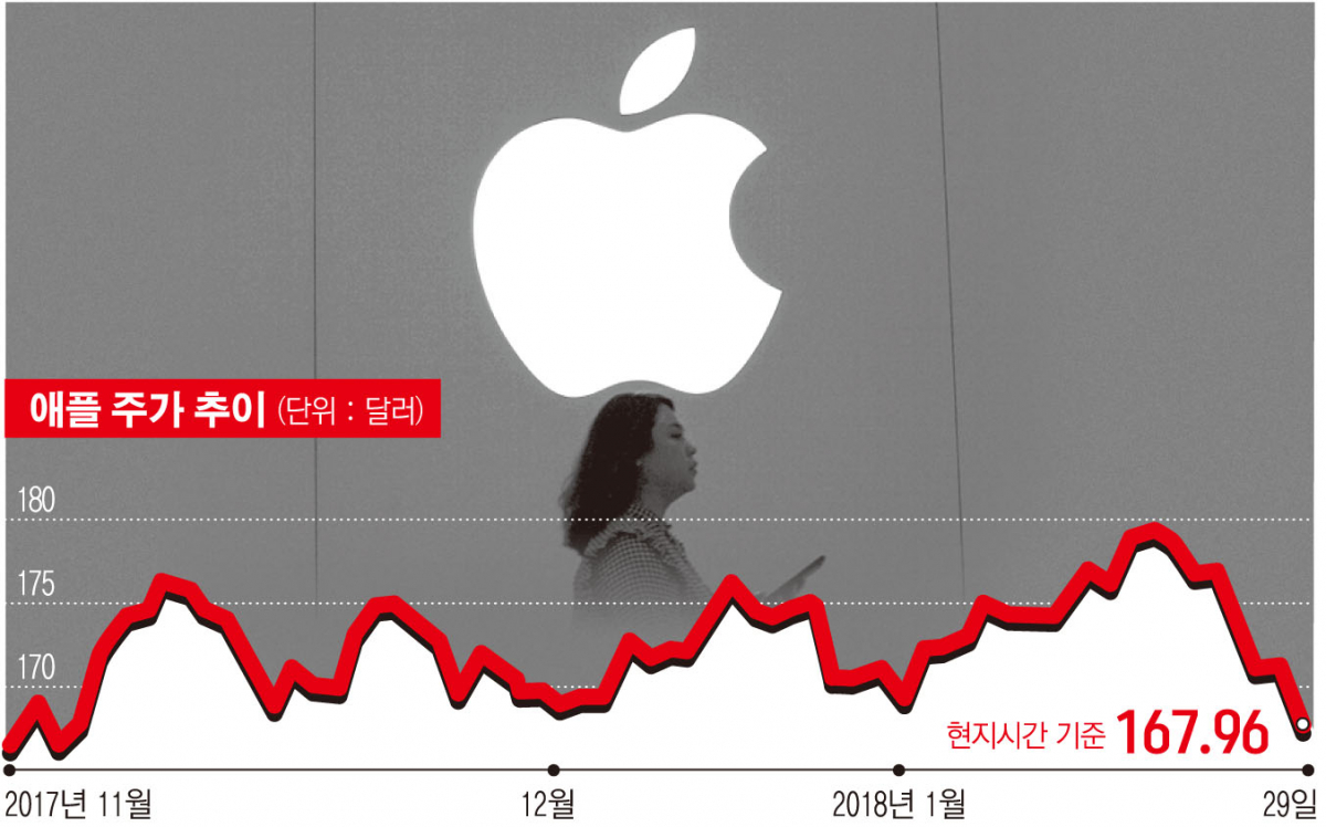 29일(현지시간) 니혼게이자이신문(이하 닛케이)은 애플이 아이폰X의 수요 부진으로 공급업체들에 생산량을 줄이겠다고 통보한 사실을 보도했다. 이 소식의 전해지자 이날 애플의 주가는 2.1% 하락했다. 22일부터 이날까지 애플의 주가는 5.1% 떨어져 시가총액이 464억 달러 감소했다.