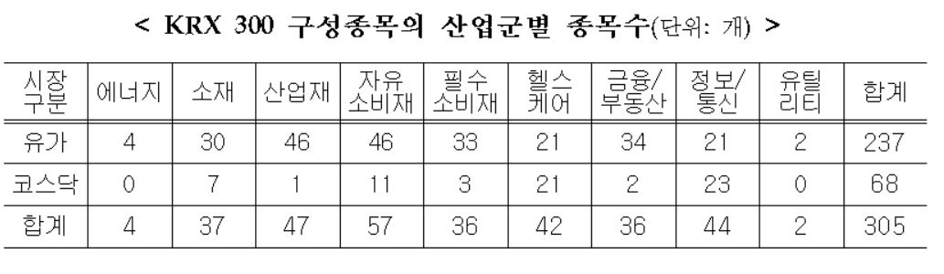 KRX300의 구성종목은 코스피 237종목, 코스닥 68종목 총 305종목으로 구성했다. 기존 300 종목에서 5개가 늘어난 것은 지난해 12월 300 종목 선정 이후 5종목이 분할, 재상장하면서 추가로 5개가 늘어났기 때문이다.