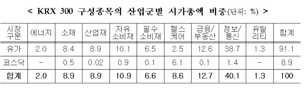 특히 코스닥시장 종목(68종목)은 주로 헬스케어(21종목)와 정보기술·통신서비스(23종목ㆍ1.4%) 산업군에서 많이 선정됐다. 이들 각각 분야별 종목이 KRX300에서 차지하는 시가총액 비중은 각각