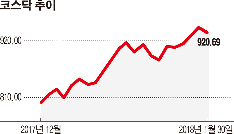 코스닥지수가 ‘900 고지’를 넘어섰다. 외국인 매수세에 힘입어 연내 1000포인트 돌파도 가시권에 들어왔다. 1월 상승폭만 128.63포인트(16.11%)에 달한다. 하지만 바이오ㆍ제약 쏠림 현상에 대한 우려의 목소리는 여전하다.