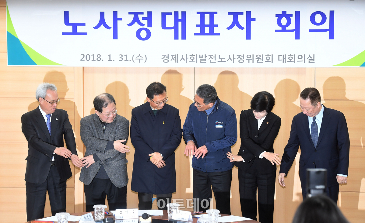 문성현 노사정위원장, 박병원 한국경영인총연합회장, 김명환 민주노총 위원장, 김주영 한국노총위원장, 김영주 고용노동부 장관, 박용만 대한상공회의소 회장(왼쪽부터)이 31일 서울 종로구 노사정위원회 대회의실에서 열린 노사정대표자 회의에서 기념촬영을 위해 손을 맞잡고 있다. 이동근 기자 foto@