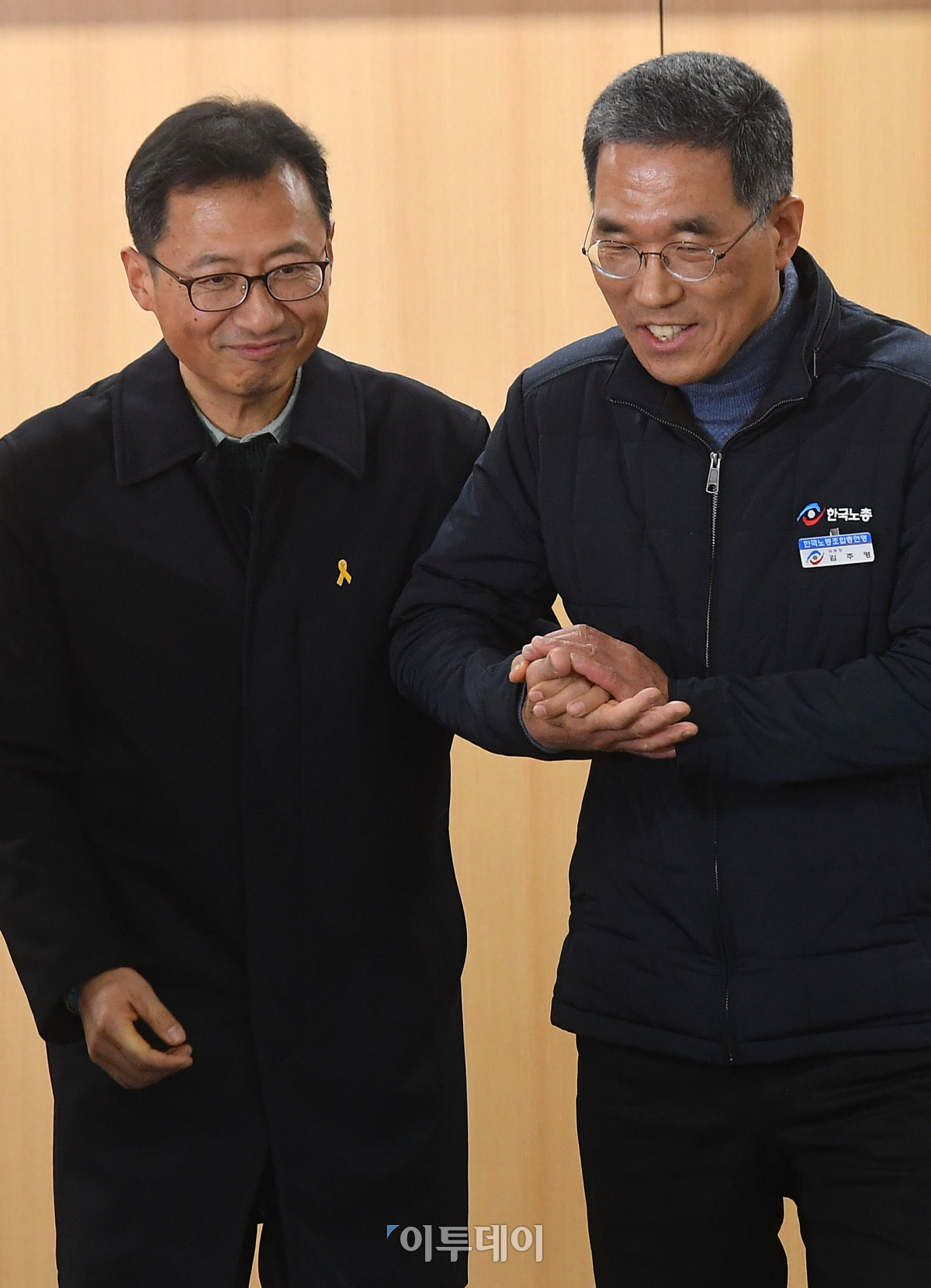 김명환(왼쪽) 민주노총 위원장, 김주영 한국노총 위원장이 31일 서울 종로구 노사정위원회 대회의실에서 열린 노사정대표자 회의에서 기념촬영을 마치고 손을 꼭 잡은채 자리로 향하고 있다. 이동근 기자 foto@