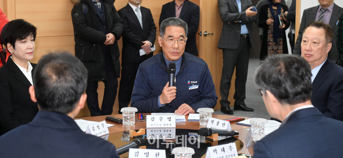 김주영(가운데) 한국노총 위원장이 31일 서울 종로구 노사정위원회 대회의실에서 열린 노사정대표자 회의에서 인사말을 하고 있다. 이동근 기자 foto@