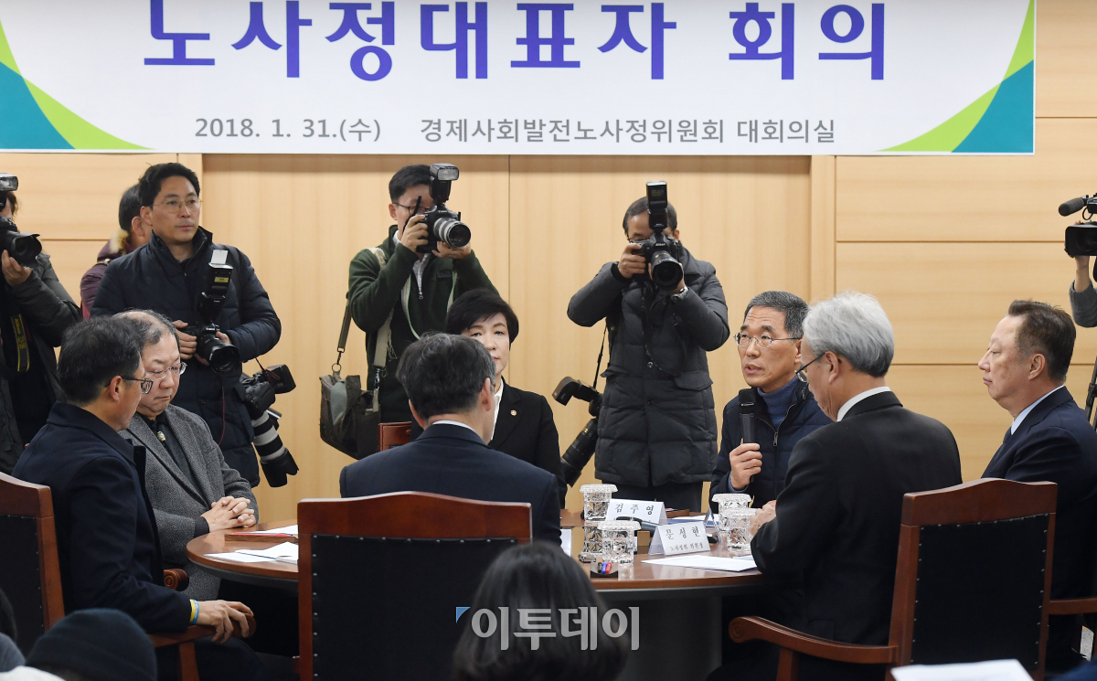 김주영 한국노총 위원장이 31일 서울 종로구 노사정위원회 대회의실에서 열린 노사정대표자 회의에서 인사말을 하고 있다. 이동근 기자 foto@