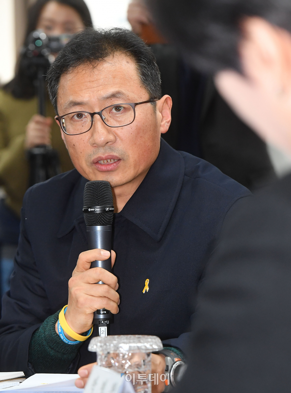 김명환 민주노총 위원장이 31일 서울 종로구 노사정위원회 대회의실에서 열린 노사정대표자 회의에서 인사말을 하고 있다. 이동근 기자 foto@