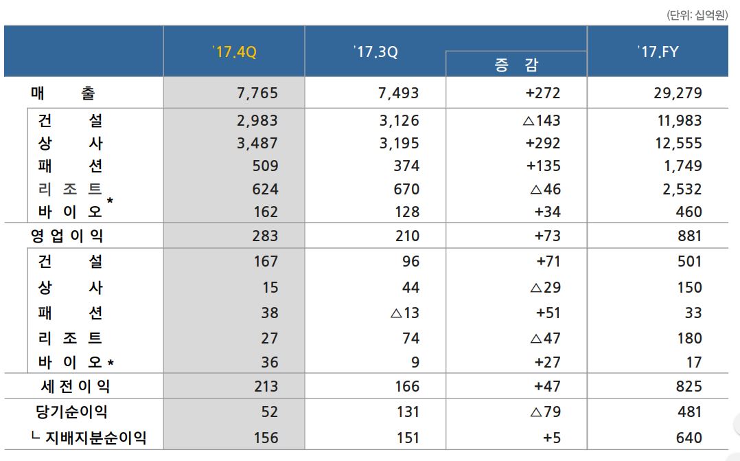 삼성물산의 패션부문은 브랜드 개편 등의 사업구조 개선으로 327억 원의 영업이익을 기록, 흑자전환에 성공했다. 리조트도 전년 대비 15.1% 상승한 1802억원의 영업이익, 바이오 역시 172억 원의 연간 흑자를 기록하면서 빠르게 신성장동력으로 자리매김하고 있다는 평가다.