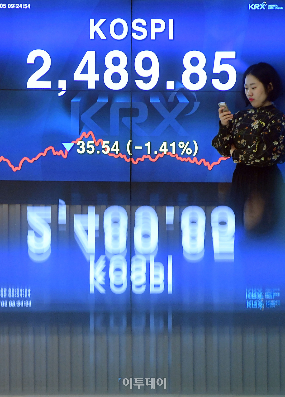 코스피가 장 초반 외국인과 개인의 동반 매도세에 밀려 급락하고 있다. 5일 오전 서울 여의도 한국거래소 전광판에 코스피 지수가 전 거래일 종가보다 35.54포인트 내린 2489.85를 나타내고 있다. 이동근 기자 foto@