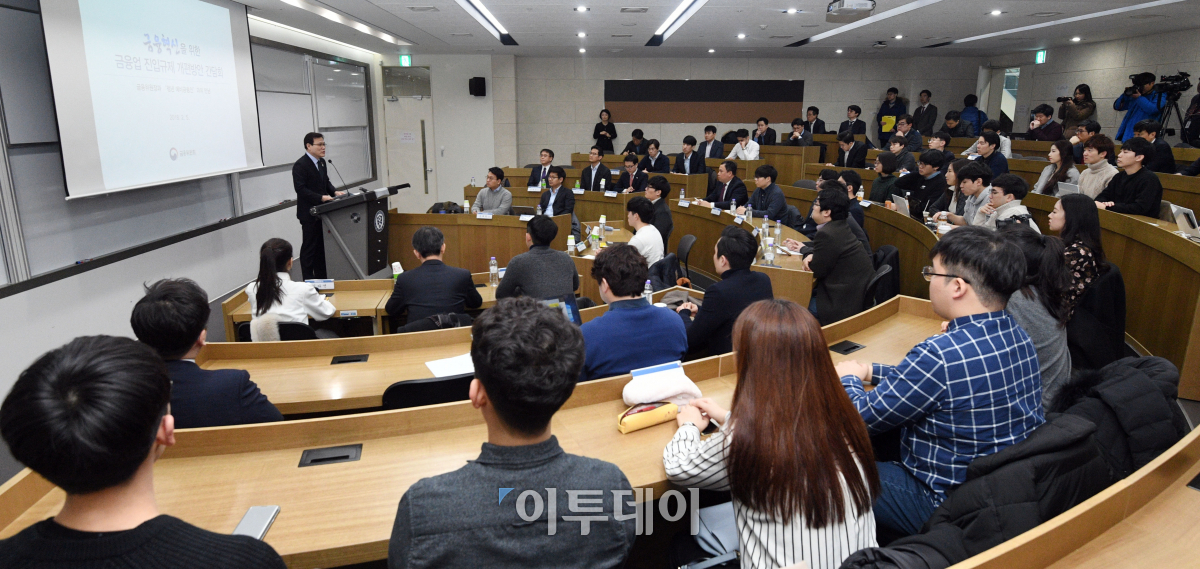 최종구 금융위원장이 5일 서울 서대문구 연세대학교 경영관에서 열린 금융혁신을 위한 금융업 진입규제 개편방안 간담회에서 인사말을 하고 있다. 이동근 기자 foto@