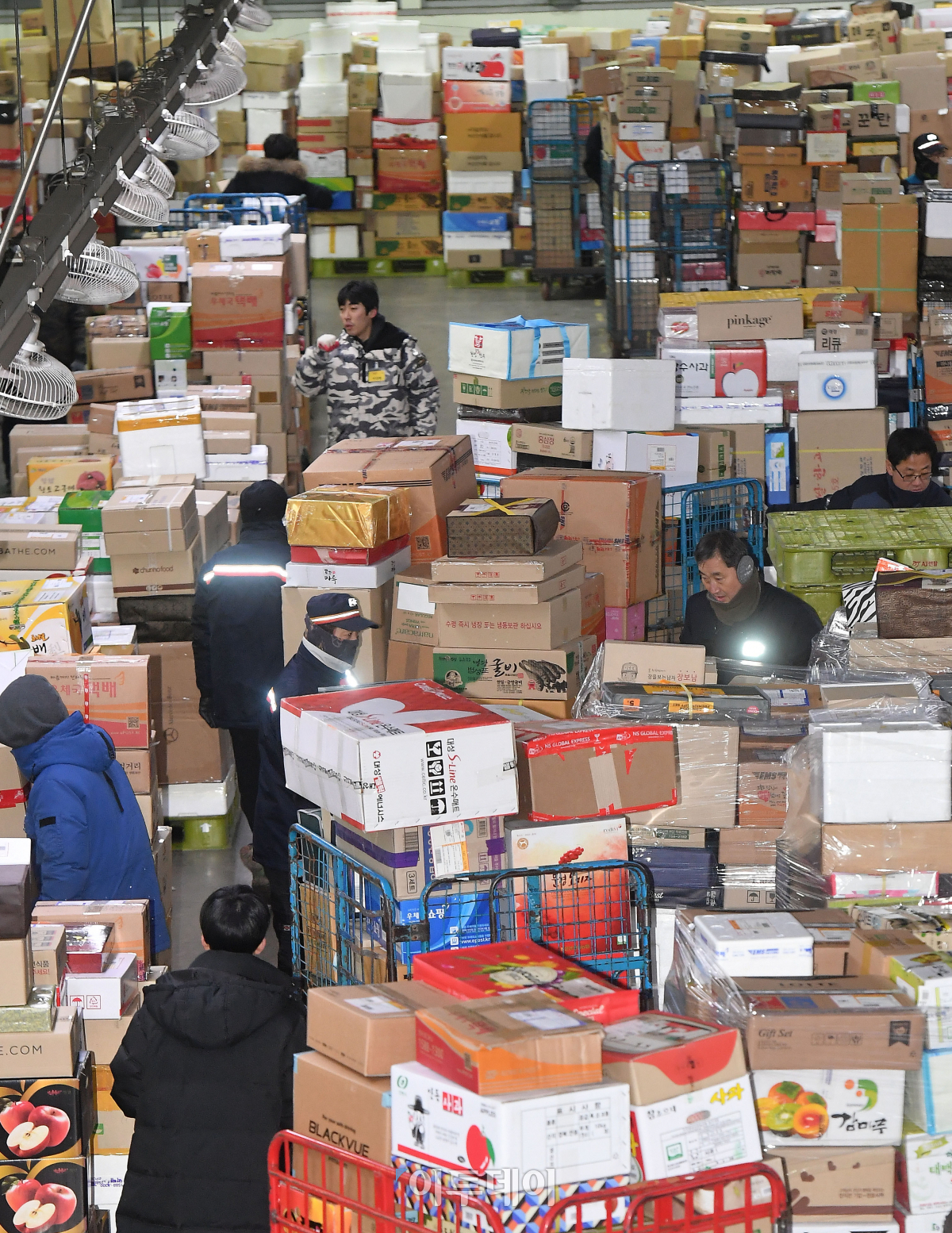 민족 대명절인 설을 열흘 앞둔 6일 오전 서울 광진구 동서울 우편 물류센터에서 관계자들이 택배 분류작업을 하고 있다. 우정사업본부는 설 택배 우편물이 평소 150%인 약 1600만 개가 접수될 것으로 예상하고 오는 20일까지 특별소통 기간으로 지정해 2800여 명의 인력과 3300여 대의 차량을 추가로 투입한다. 이동근 기자 foto@