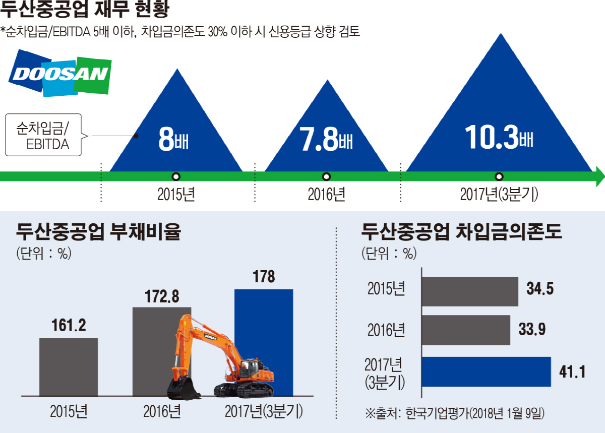 두산중공업은 지난해 9월 말 기준 4조4851억 원에 달하는 순차입금을 줄이기 위해 이번 매각에 나섰다. 한국기업평가는 지난달 9일 두산중공업의 재무부담 확대를 이유로 이 회사의 신용등급을 BBB+로 하향 조정했다.