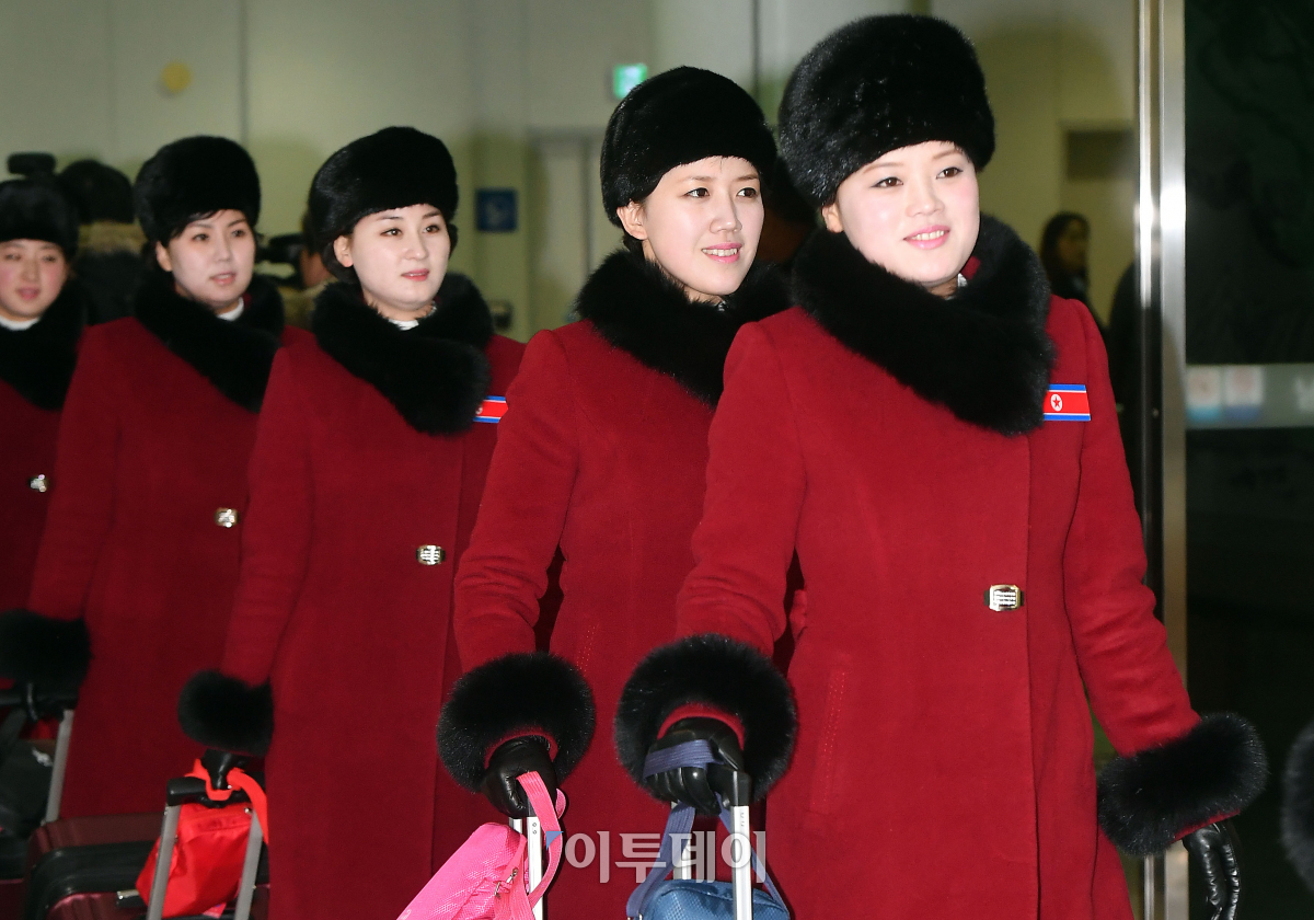[포토] 미소지으며 남으로...북한 응원단 도착