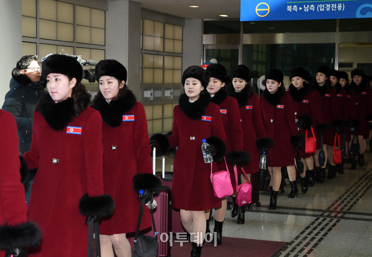 북한 응원단이 7일 오전 경의선 육로를 통해 경기 파주시 남북출입사무소로 입경하고 있다. 사진공동취재단