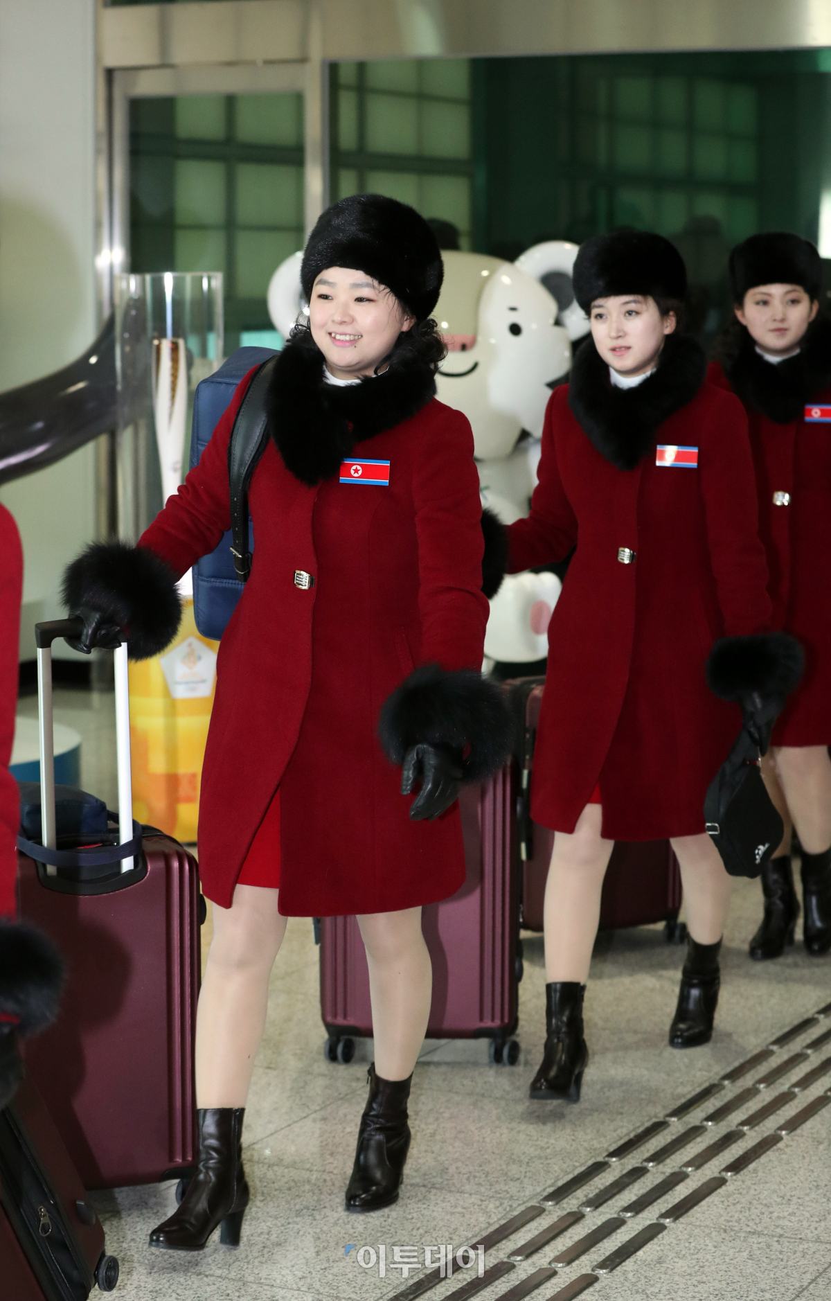 북한 응원단이 7일 오전 경의선 육로를 통해 경기 파주시 남북출입사무소로 입경하고 있다. 사진공동취재단