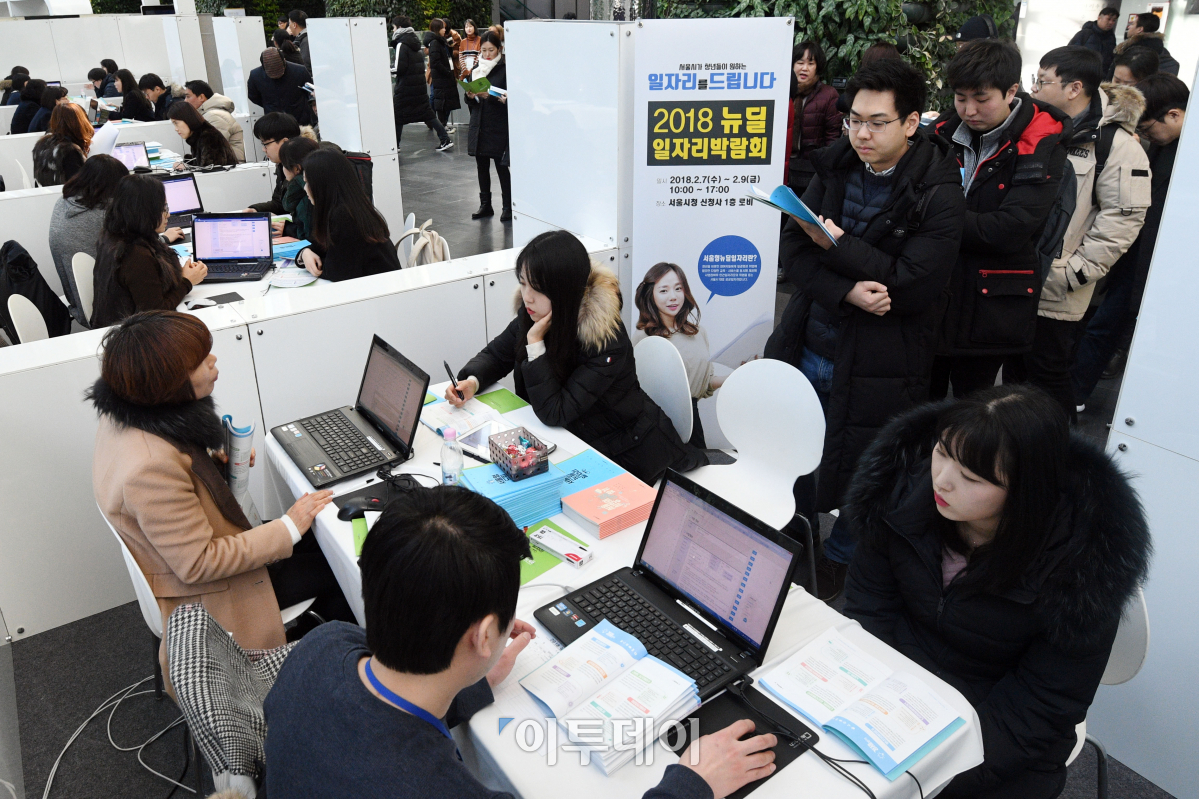 2018 뉴딜일자리박람회가 7일 서울시청 신청사 로비에서 열린 가운데 구직자들이 취업상담을 받고 있다. 오는 9일까지 열리는 이번 박람회는 서울시가 청년구직자들에게 공공업무경험과 전문기술 취업 지원을 제공한다. 이동근 기자 foto@