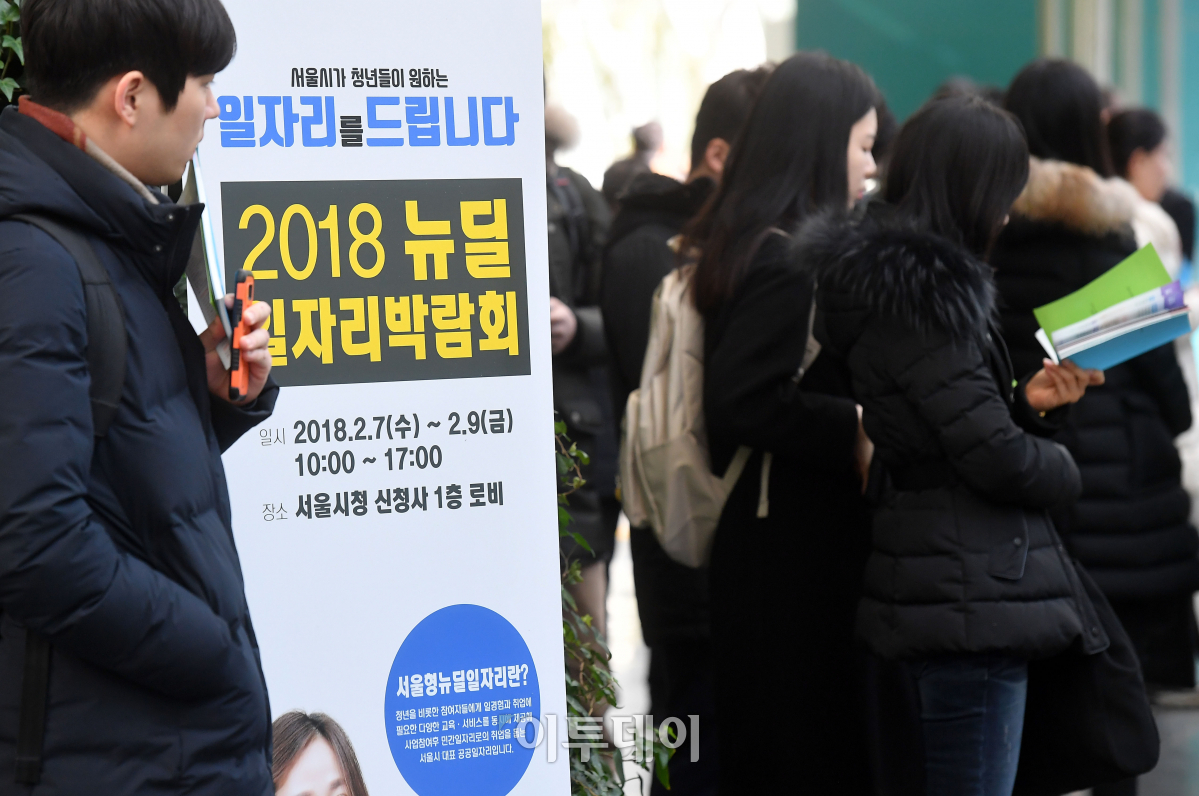 2018 뉴딜일자리박람회가 7일 서울시청 신청사 로비에서 열린 가운데 구직자들이 취업상담 순서를 기다리고 있다. 오는 9일까지 열리는 이번 박람회는 서울시가 청년구직자들에게 공공업무경험과 전문기술 취업 지원을 제공한다. 이동근 기자 foto@