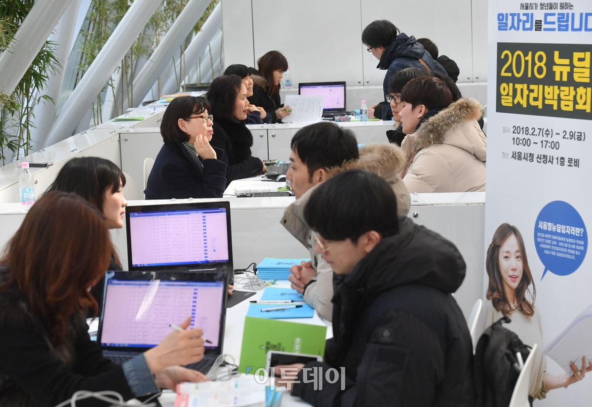 2018 뉴딜일자리박람회가 7일 서울시청 신청사 로비에서 열린 가운데 구직자들이 취업상담을 받고 있다. 오는 9일까지 열리는 이번 박람회는 서울시가 청년구직자들에게 공공업무경험과 전문기술 취업 지원을 제공한다. 이동근 기자 foto@