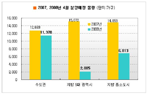 반면, 지방 광역시는 지난해 1만5072가구에서 2085가구, 지방 중소도시는 1만4859에서 6813가구로 지방물량이 급감한 것으로 나타났다.
