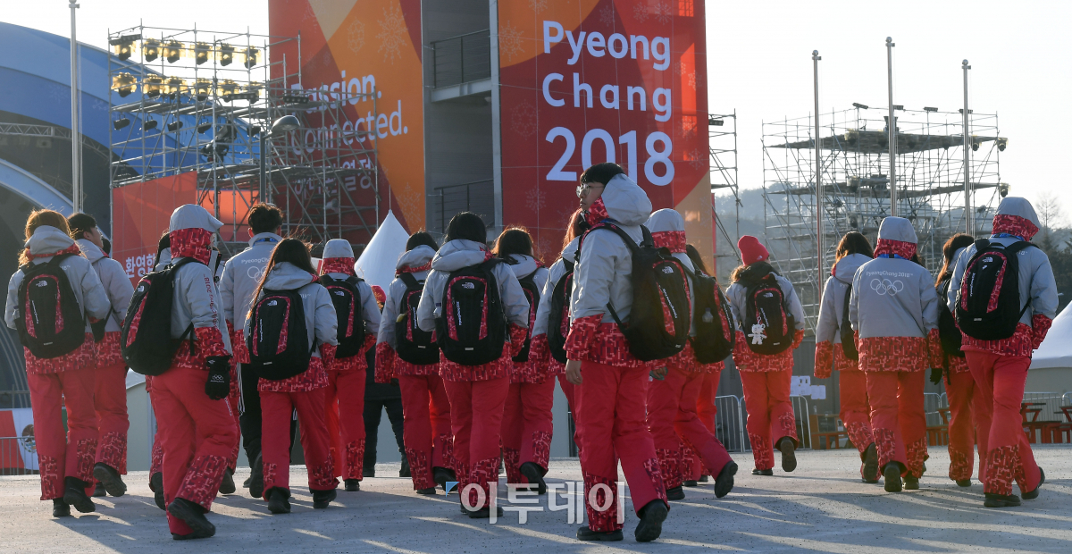 2018 평창 동계올림픽 개막을 하루 앞둔 8일 강원 평창군 평창올림픽플라자에서 자원봉사자들이 사전교육을 받기위해 이동하고 있다. 이동근 기자 foto@
