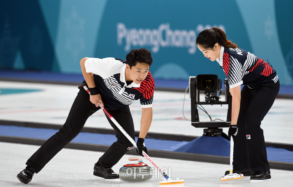 8일 강릉컬링센터에서 열린 평창동계올림픽 믹스더블 예선 한국과 중국의 경기에서 이기정과 장혜지가 스위핑을 하고 있다. 이동근 기자 foto@