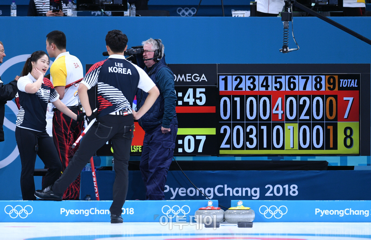 8일 강릉컬링센터에서 열린 평창동계올림픽 믹스더블 예선 한국과 중국의 경기에서 이기정과 장혜지가 7대 8로 패한 뒤 아쉬워 하고 있다. 이동근 기자. foto@