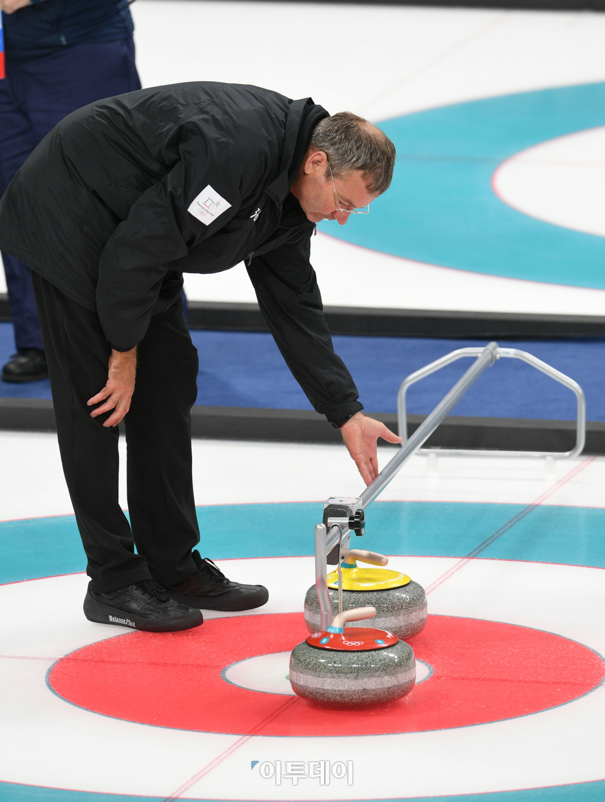 8일 강릉컬링센터에서 열린 평창동계올림픽 믹스더블 예선 한국과 중국의 경기에서 4앤드가 끝난 뒤 심판이 양팀의 스톤과 티까지의 거리를 각각 측정하고 있다. 이동근 기자 foto@