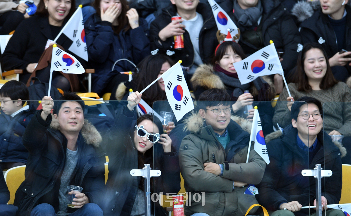 8일 강릉컬링센터에서 열린 평창동계올림픽 믹스더블 예선 한국과 중국의 경기에서 관중들이 태극기를 흔들며 응원하고 있다. 이동근 기자 foto@