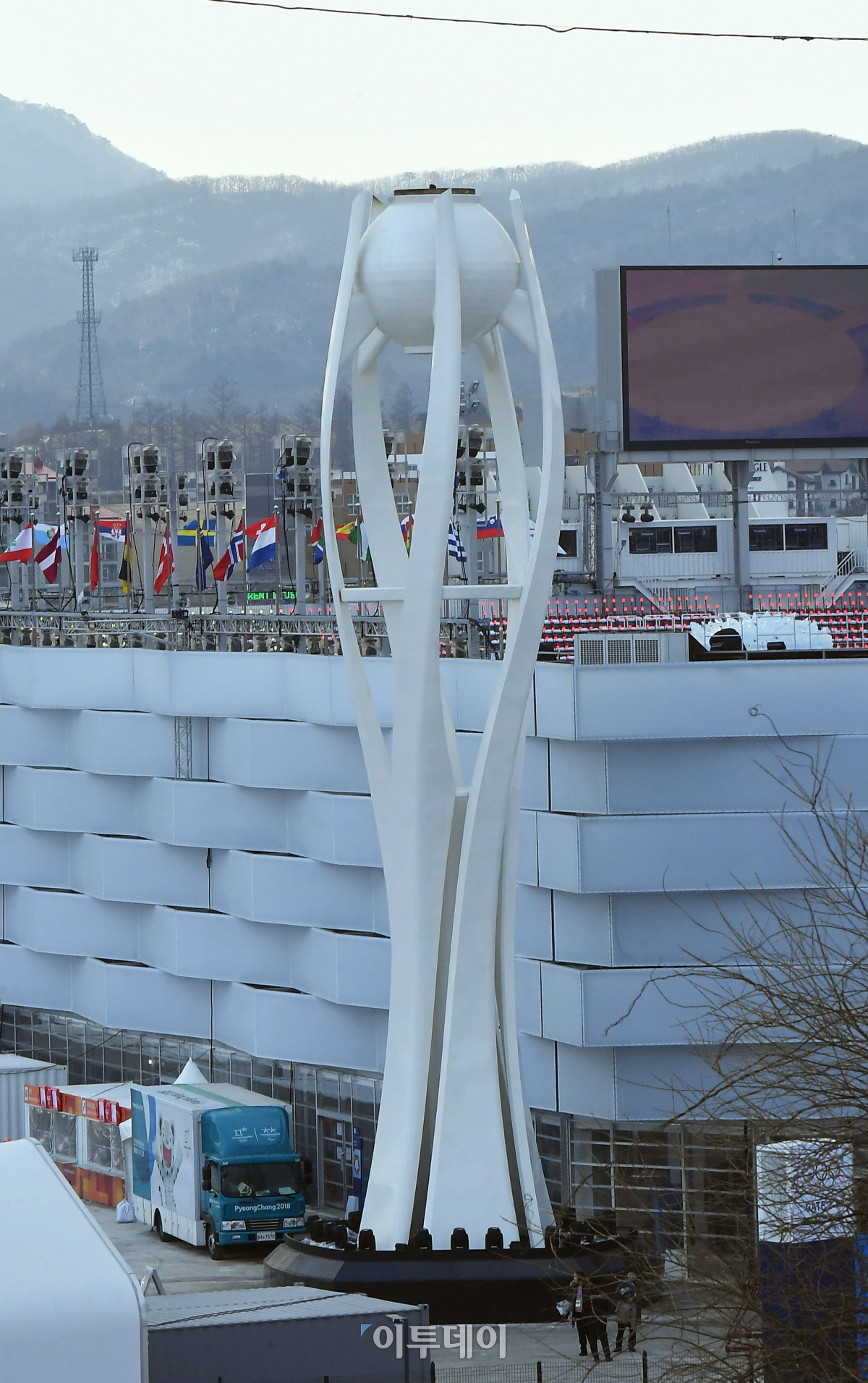 2018 평창 동계올림픽 개막날이 밝았다. 평창과 강릉, 정선 일원에서 열리는 이번 올림픽은 총 92개국 2920명의 선수가 출전해 동계올림픽 사상 역대 최대 규모로 열린다. 9일 오전 평창올림픽플라자에 웅장한 위용을 자랑하는 성화대가 30년 만에 국내에서 타오를 성화를 기다리고 있다. 이동근 기자 foto@