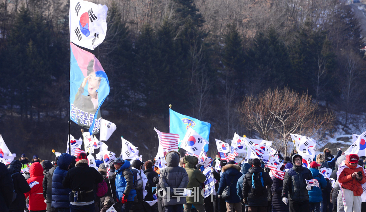 2018 평창 동계올림픽의 개막식일인 9일 강원도 평창군 대관령면 대관령 환승 주차장에서 남북 공동입장 및 단일팀에 반대하는 단체들이 태극기 집회를 하고 있다. 이동근 기자 foto@