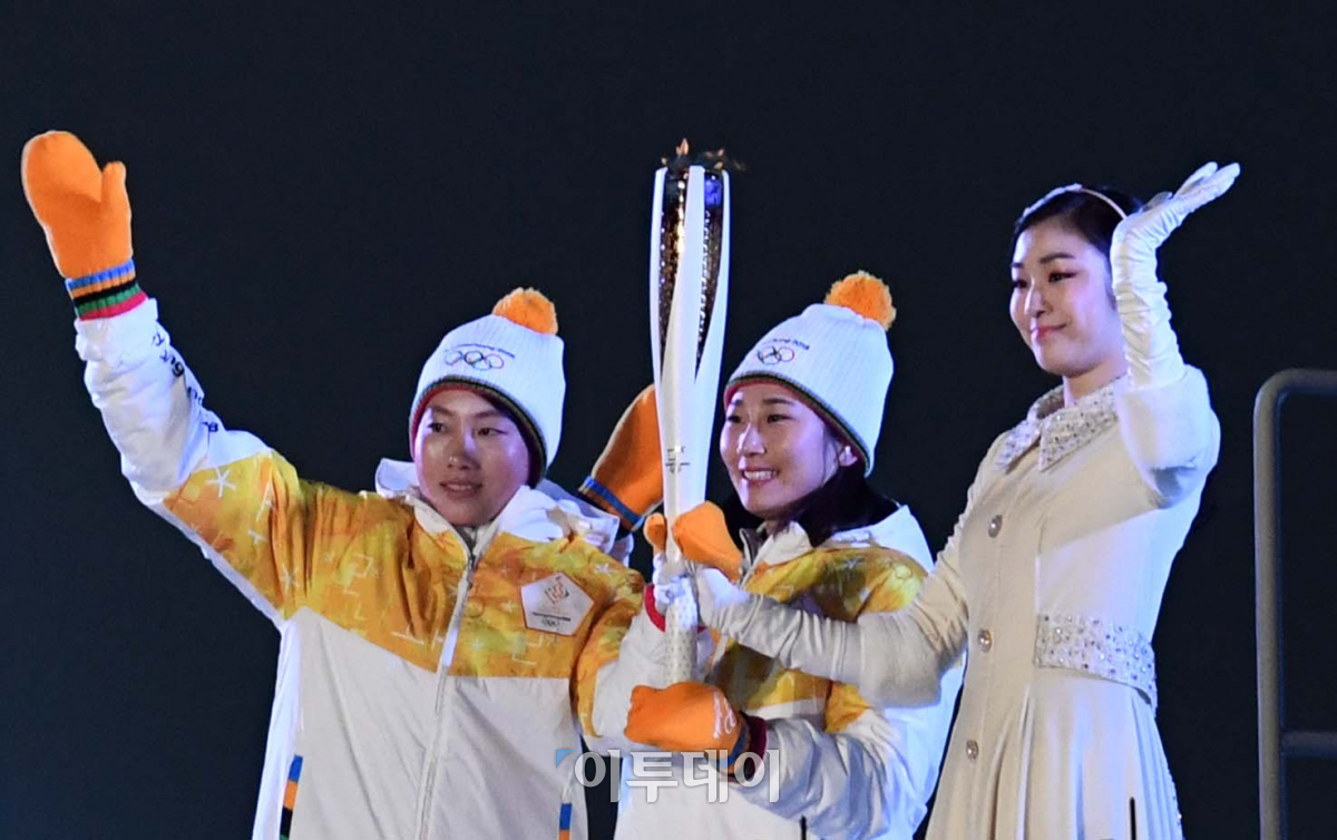 9일 강원도 평창 올림픽 스타디움에서 열린 2018 평창 동계올림픽 개막식에서 '피겨여왕' 김연아가 성화 최종 주자로 나서고 있다. 이동근 기자 foto@